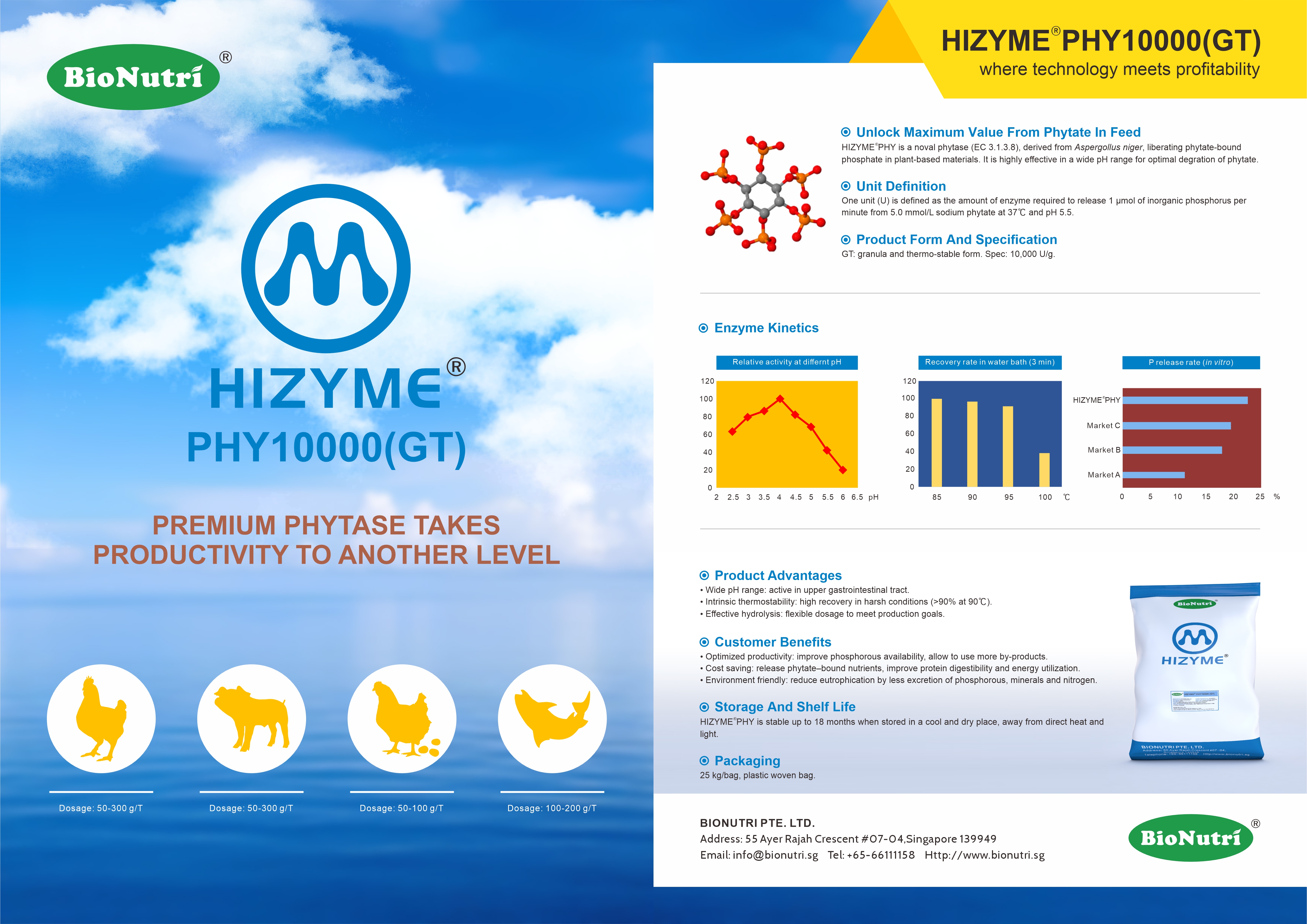 HIZYME® PHY is an advanced 6-phytase designed for monogastric animals, optimizing phytate utilization for improved nutrient digestbility. With inherent heat stability, it ensures consistent performance even under high-temperature conditions.